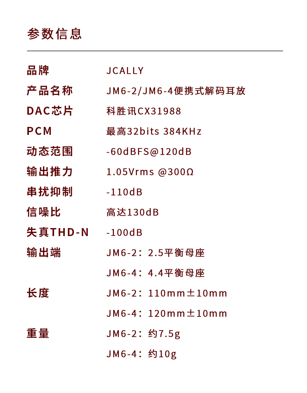 无论是日常通勤、居家聆听,还是专业监听使用,JM6-2 / JM6-4 解码耳放都能为您提供纯净、稳定、高解析力的音频输出体验,是您随身音乐生活的理想之选。