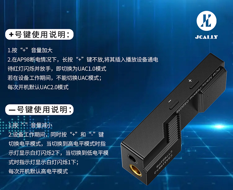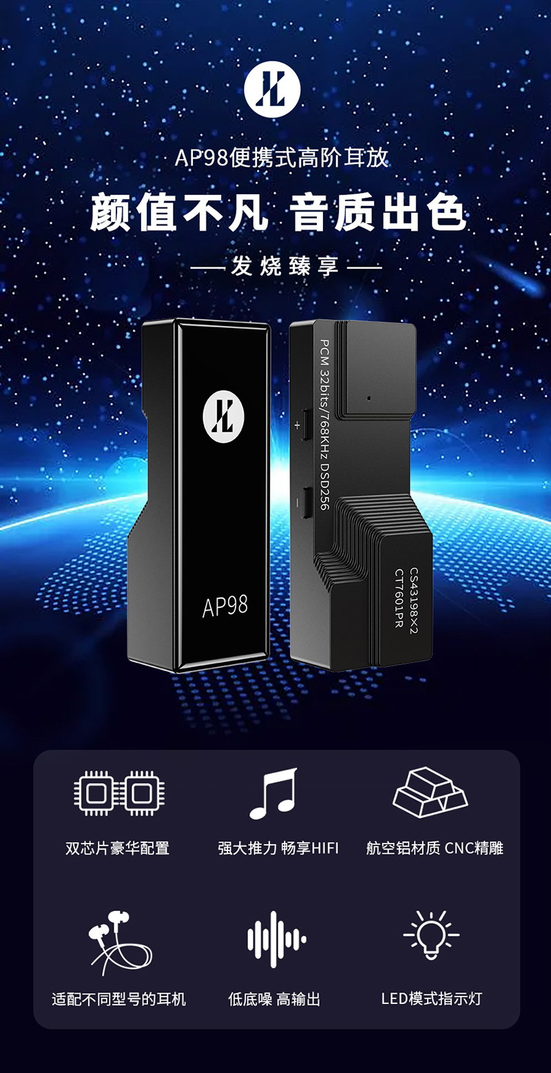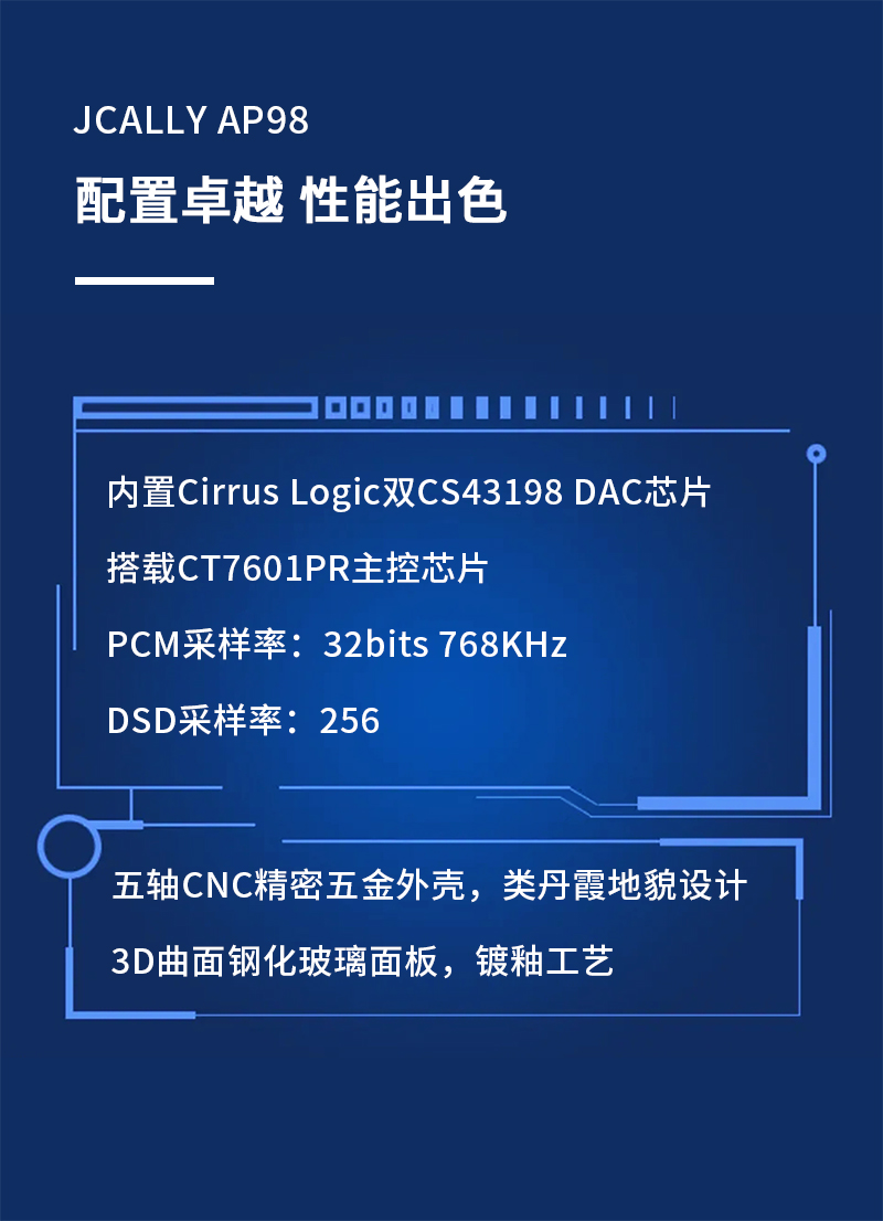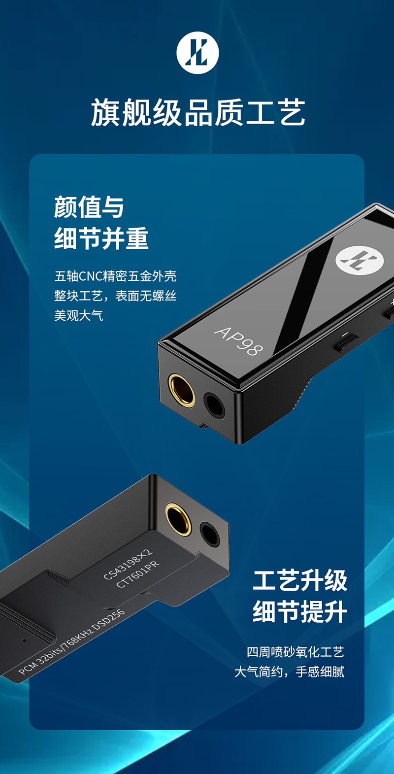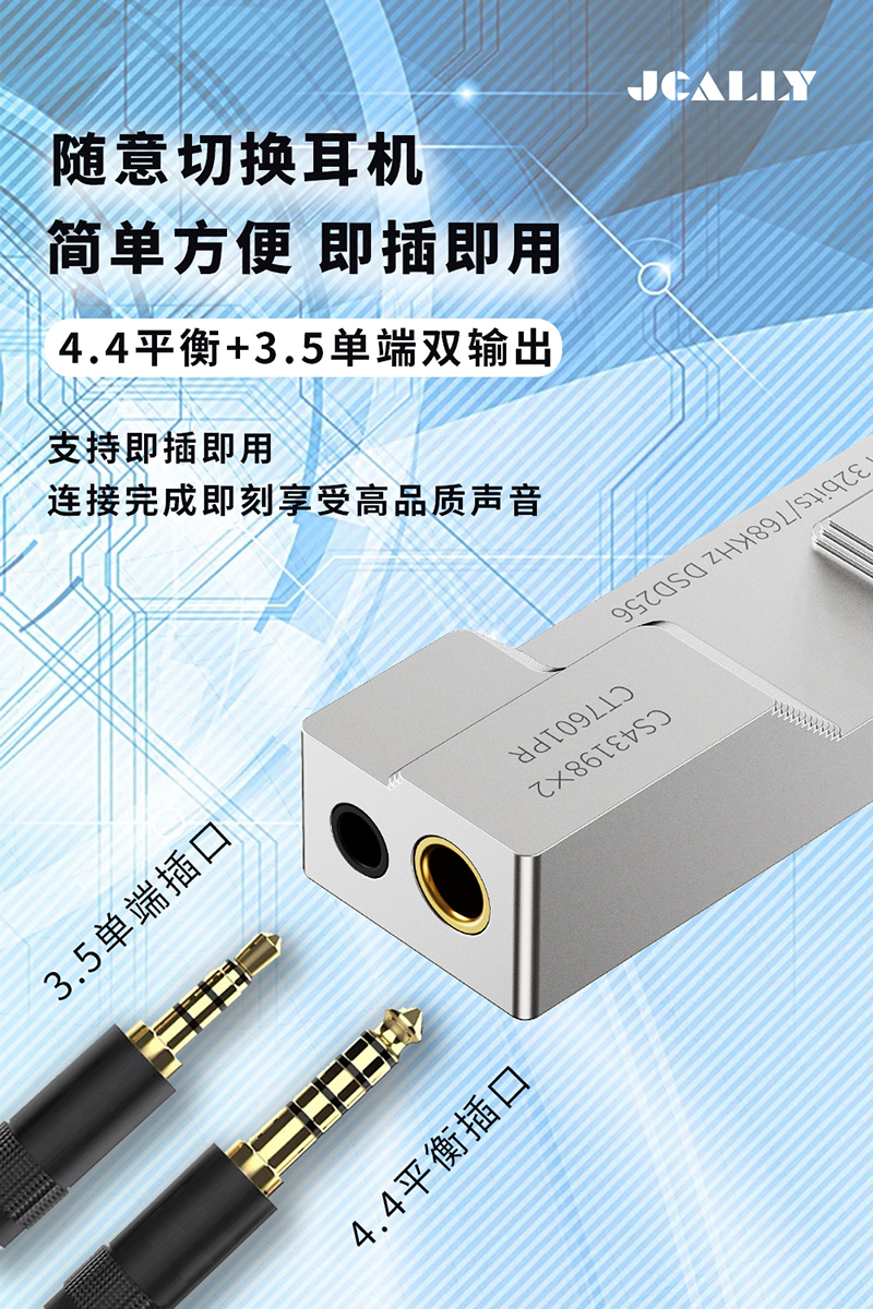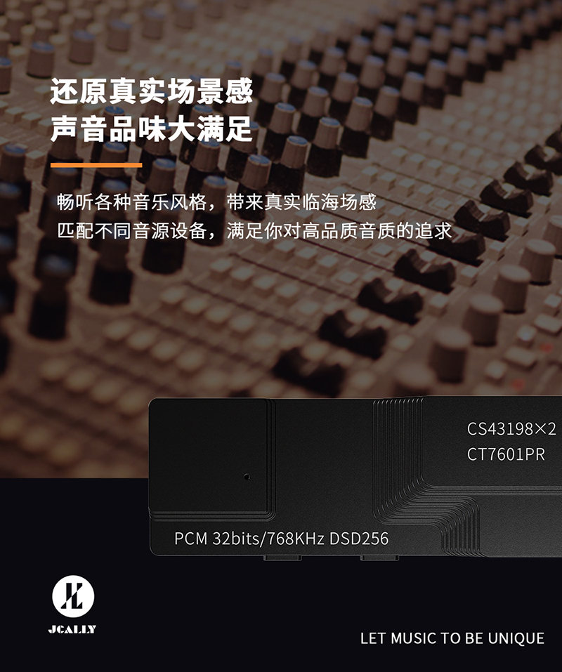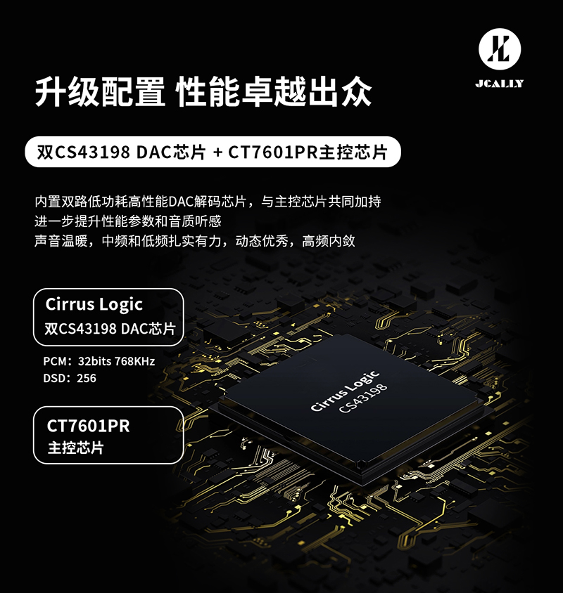 JCALLY AP98是一款专为追求极致音质体验的音乐爱好者打造的便携式高端耳机放大器。采用升级版双“芯”架构设计,内置两颗CS43198 DAC解码芯片,配合主控芯片CT7601PR,构建出强大的音频处理系统。该组合可支持高达32bit/768kHz PCM格式音频以及DSD256原生解码,精准还原声音细节,呈现无损级Hi-Fi音质。无论是人声、乐器还是交响乐,都能清晰呈现每一个音符的质感与层次感。